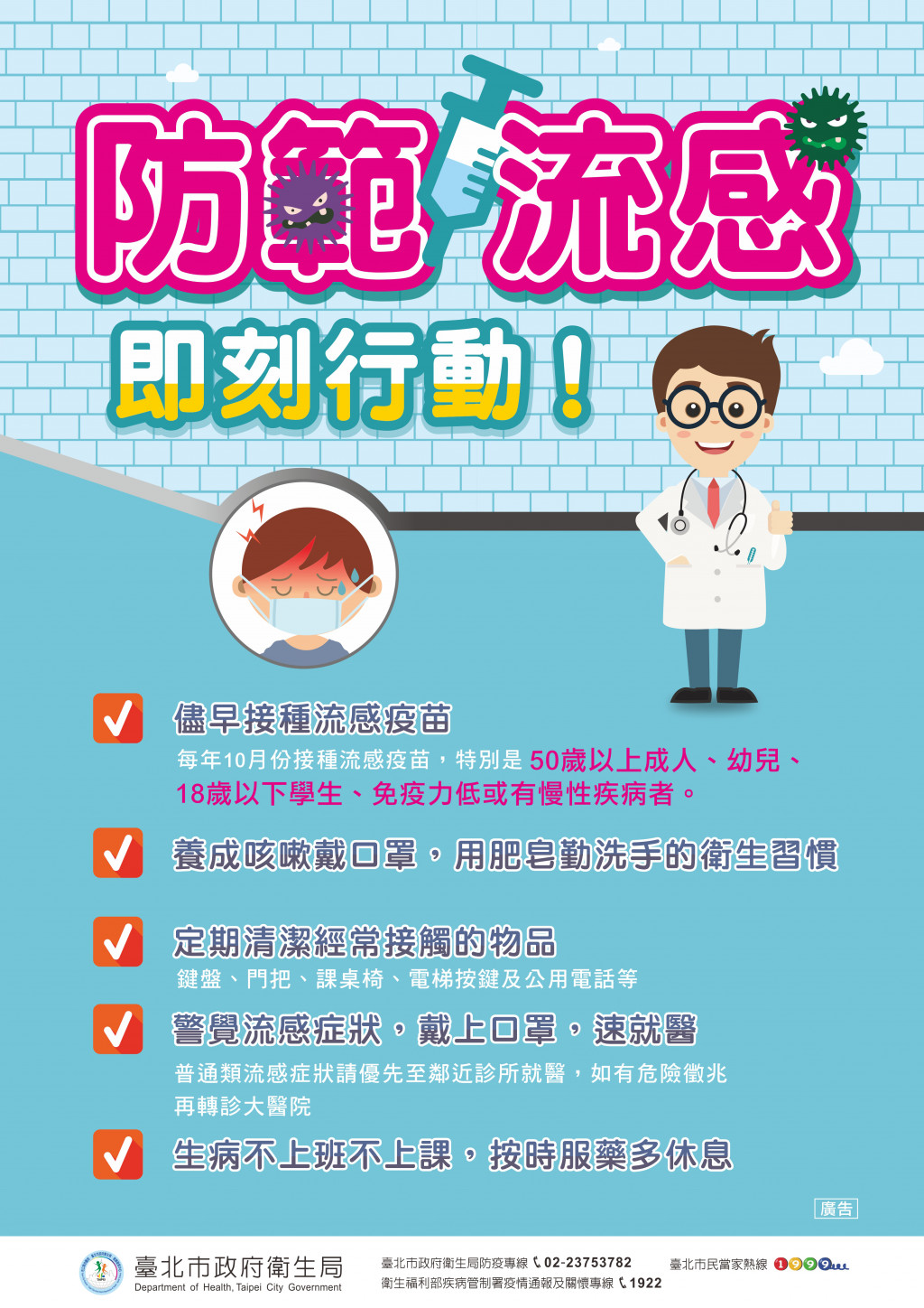宣導「生病不上課、不上班」觀念,並落實群聚通