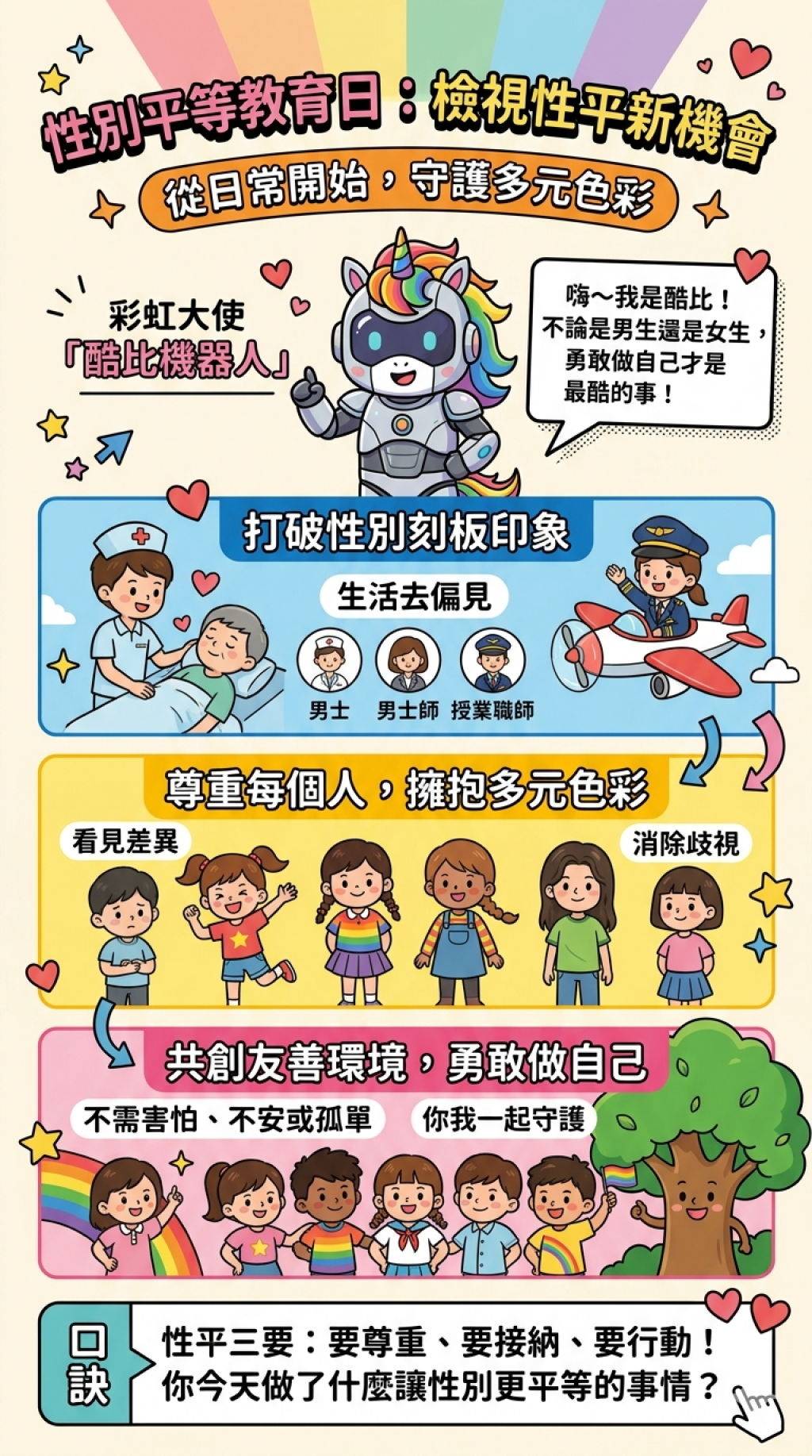 今天是 4 月 20 日「性別平等教育日」,老師想趁這個機會,跟全校的小朋友分享幾個關於「尊重」與「做自己」的觀念。